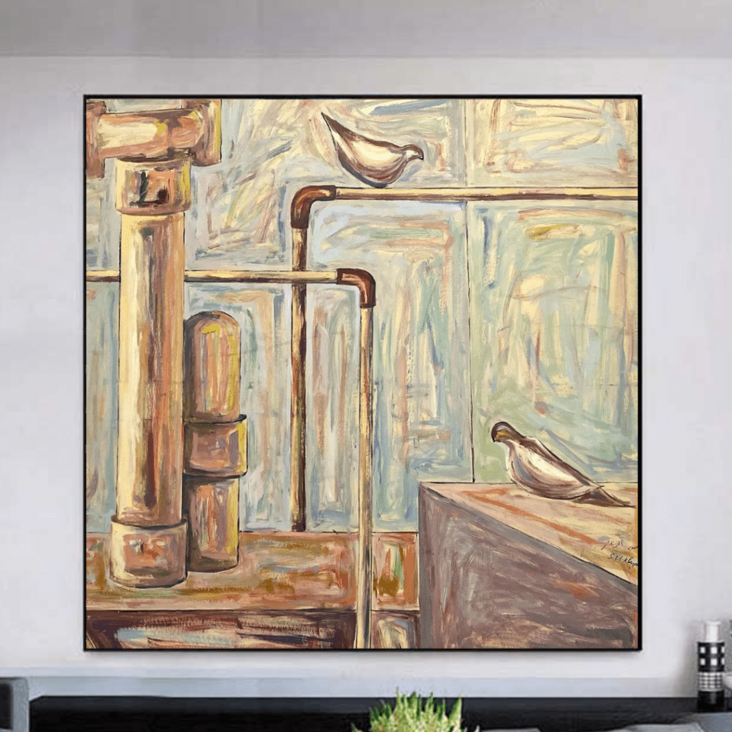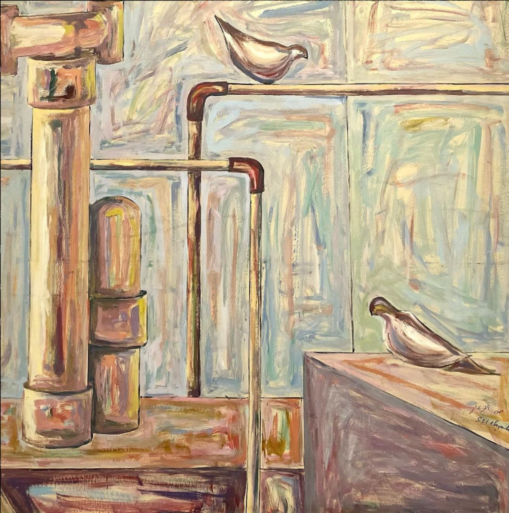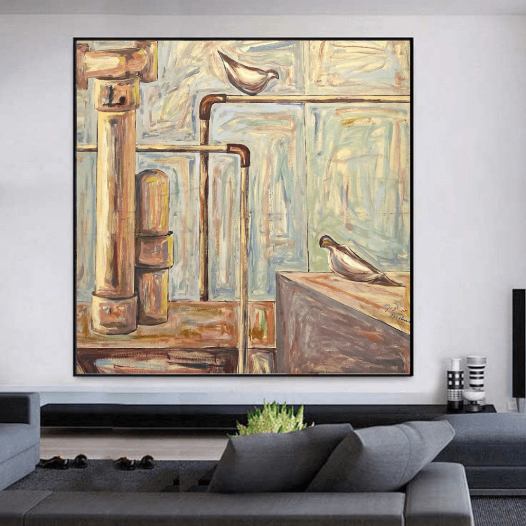 A serene and thoughtful scene of birds perched on industrial pipes and structures. The muted color palette and soft brushstrokes create a calming atmosphere, highlighting the juxtaposition of nature and man-made elements. The painting evokes a sense of quiet reflection and balance.