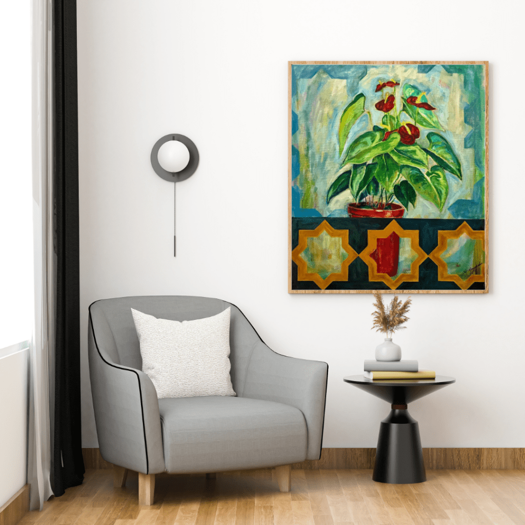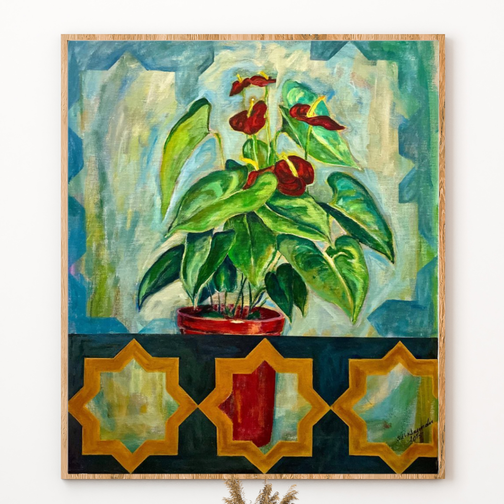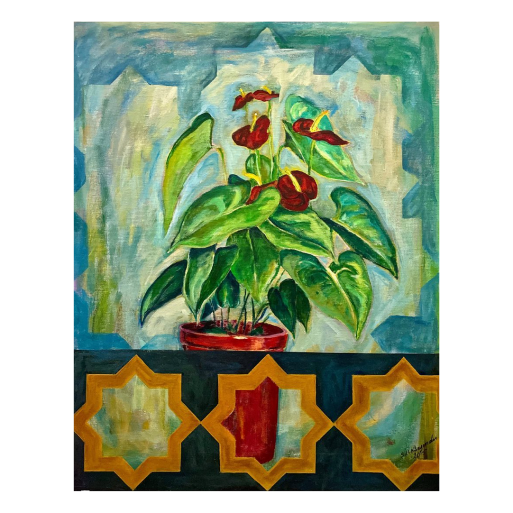 A lush green plant with vibrant red flowers in a terracotta pot, set against a serene background with soft blue and green tones. The foreground is adorned with a repeating Islamic geometric pattern in gold, creating a harmonious blend of nature and artistry.