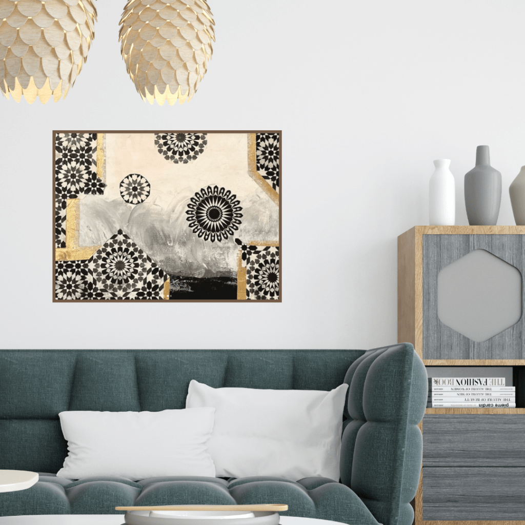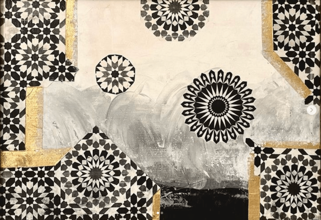An intricate arrangement of black and white Islamic geometric patterns, interspersed with subtle touches of gold leaf. The dynamic composition is set against a textured background of gray and white, creating a striking contrast that highlights the meticulous detail and rhythmic harmony of the patterns.