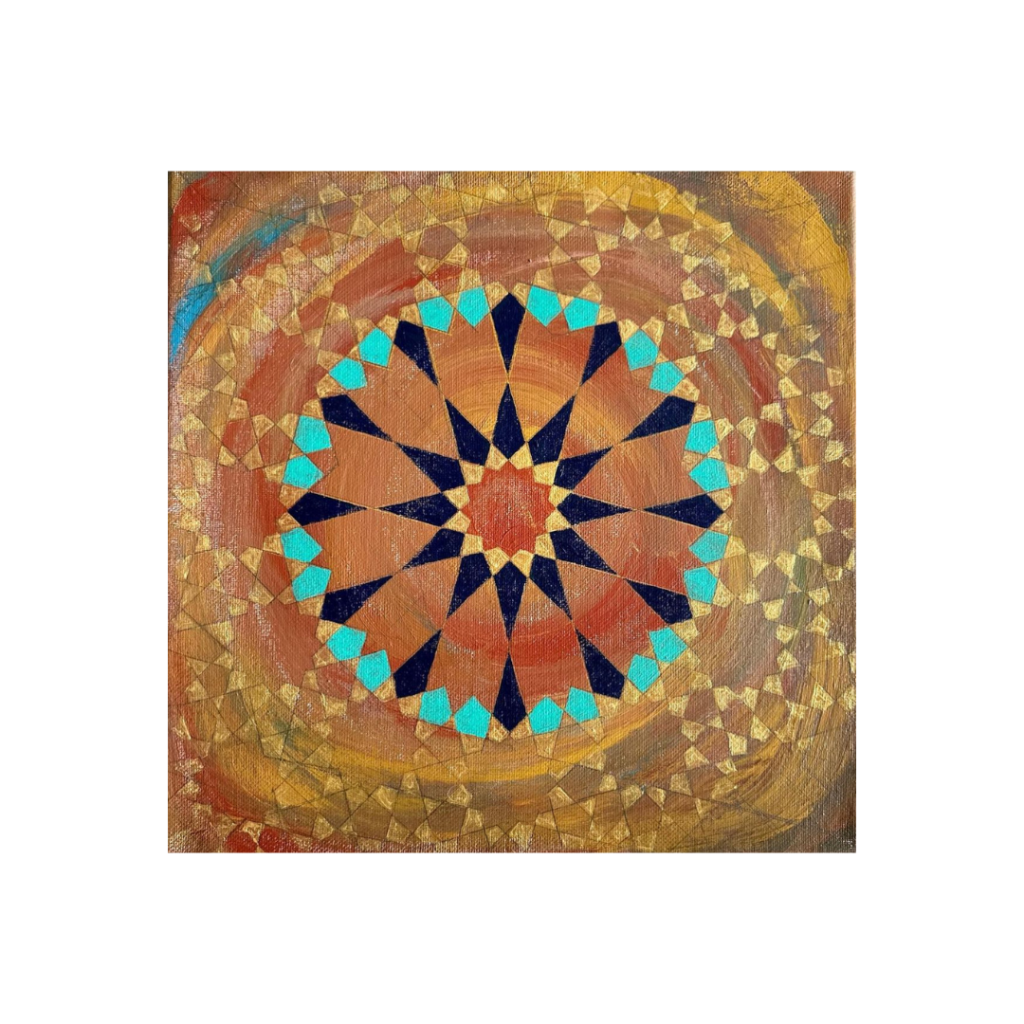 An intricate Islamic pattern rendered in earthy brown tones, accented with teal and gold. The symmetry and delicate geometric designs evoke a sense of tranquility and balance, making it a beautiful addition to any space.