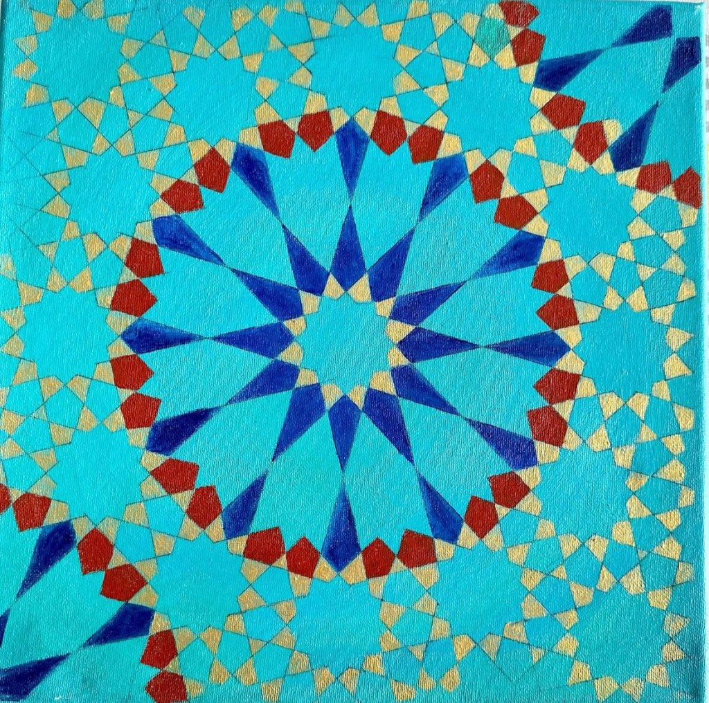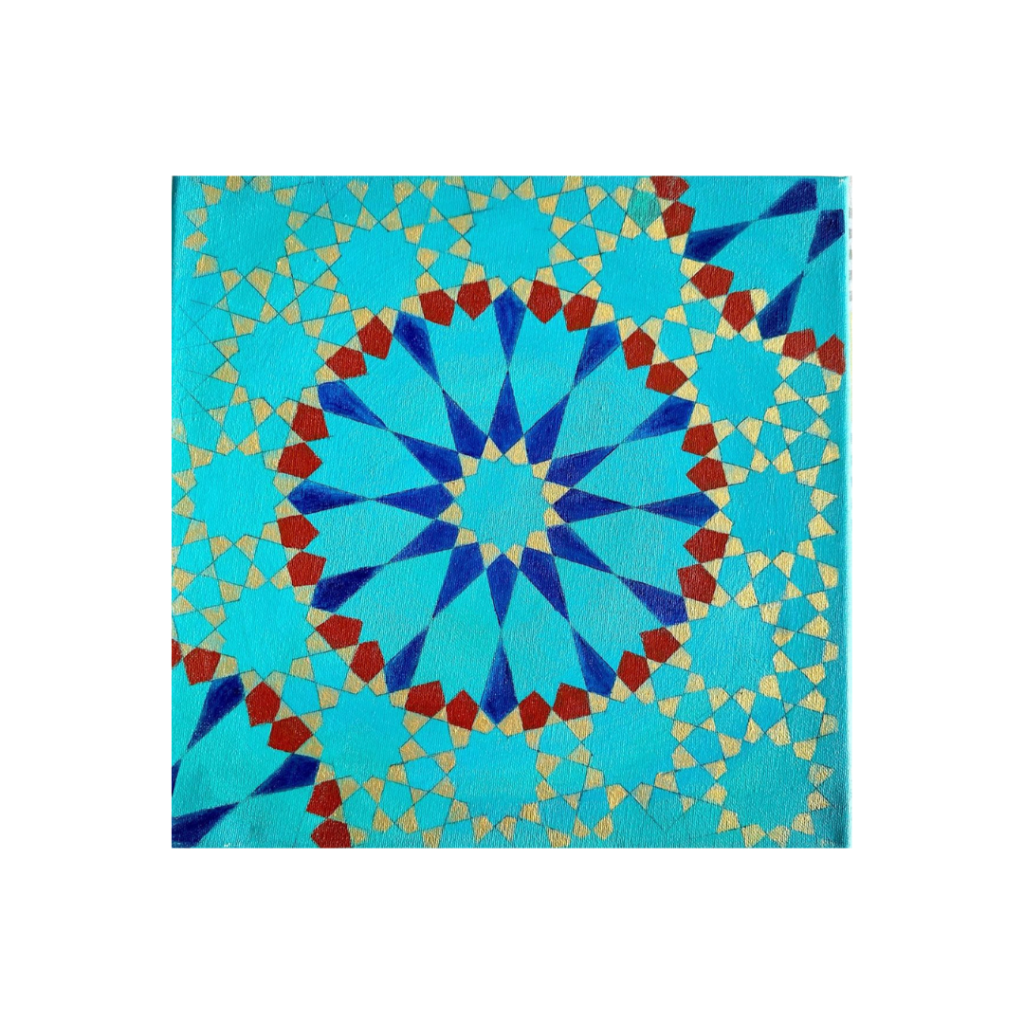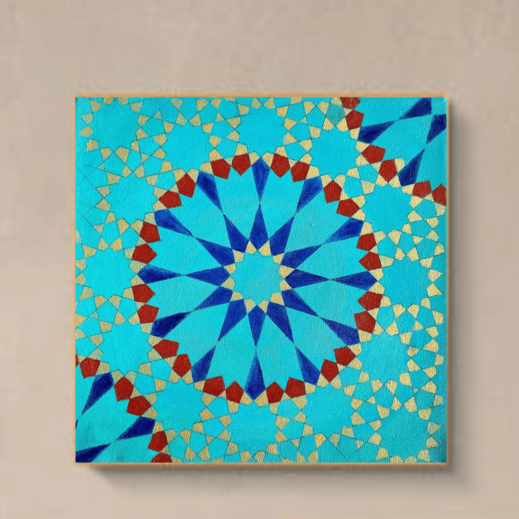 An intricate Islamic pattern rendered in vibrant turquoise, red, and gold. The symmetry and delicate geometric designs evoke a sense of calm and balance, making it a beautiful addition to any space.