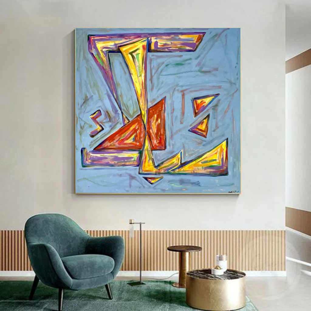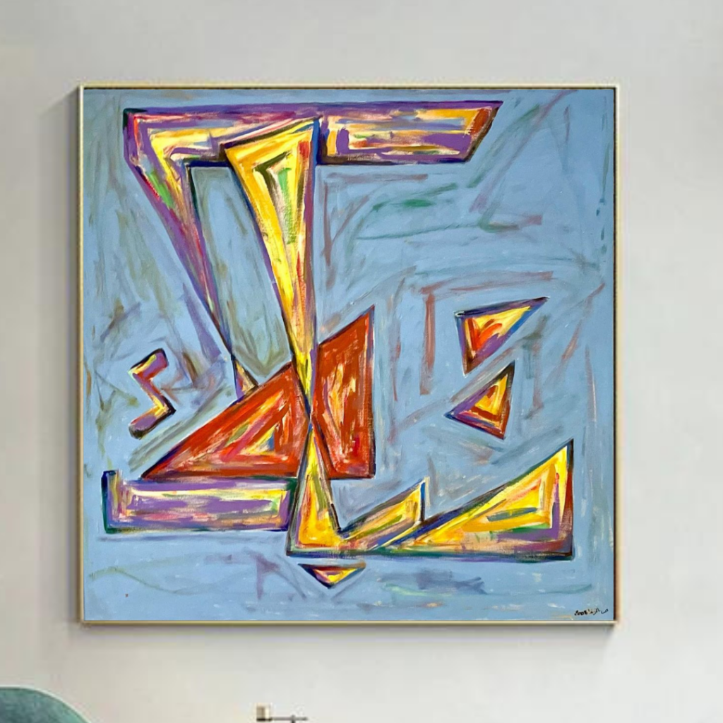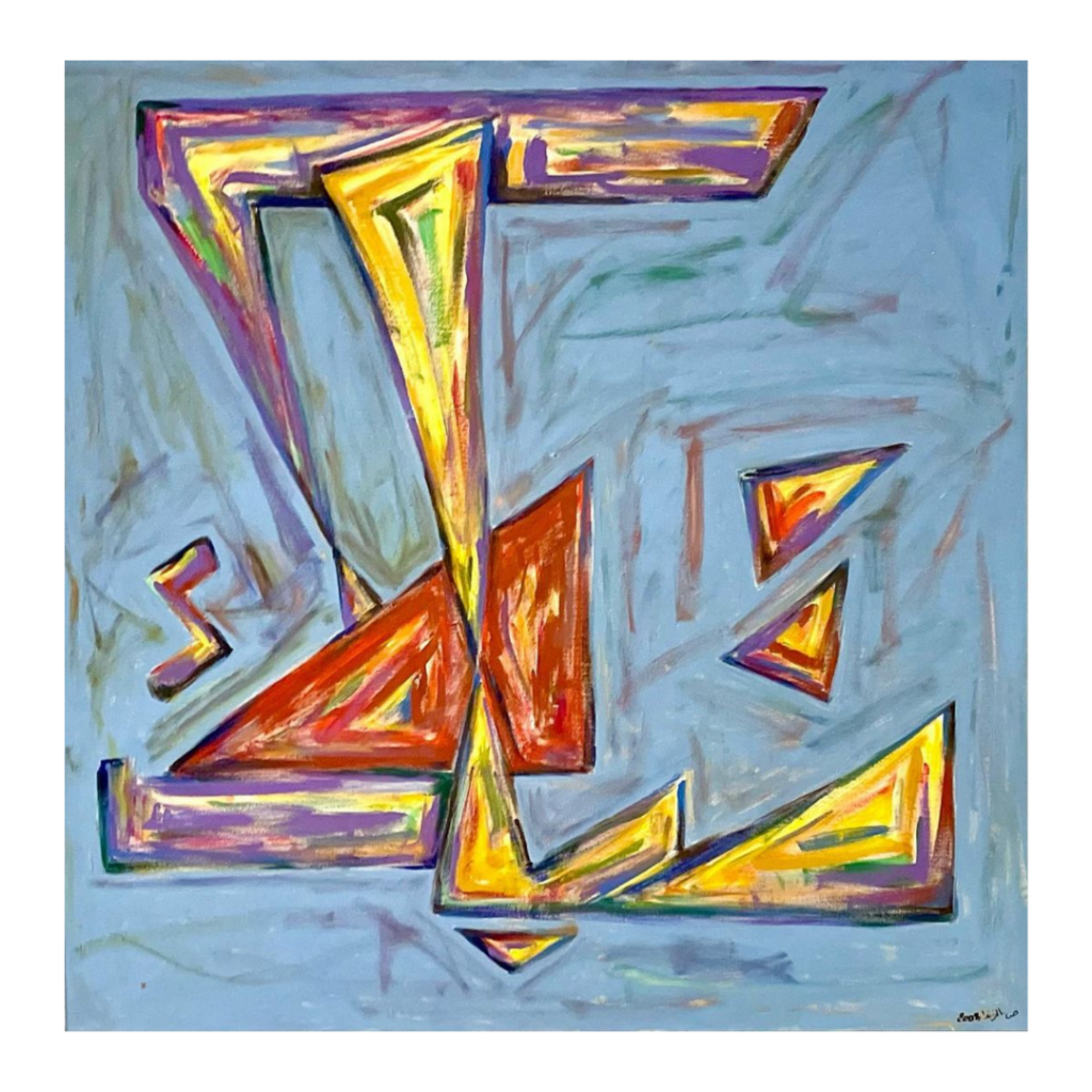 “Tabarak” (تبارك), meaning “Blessed” in Arabic, features dynamic and vibrant calligraphy set against an abstract background. The bold colors and expressive brushstrokes create a sense of movement and energy, reflecting the powerful and sacred meaning of the word.