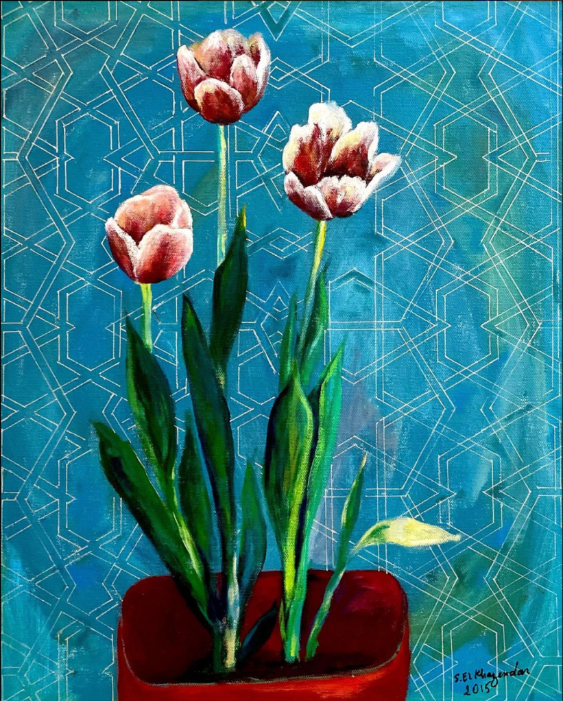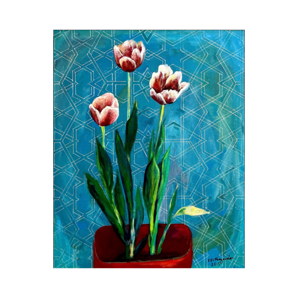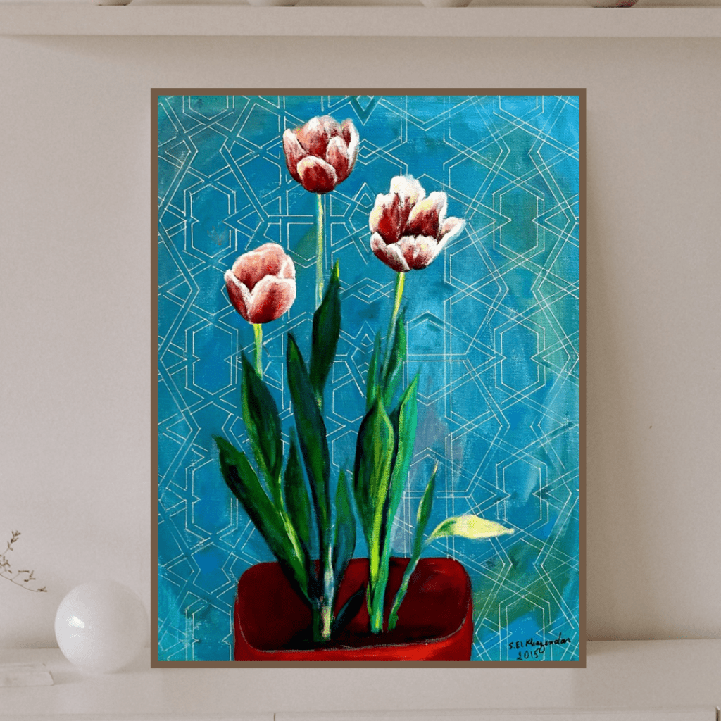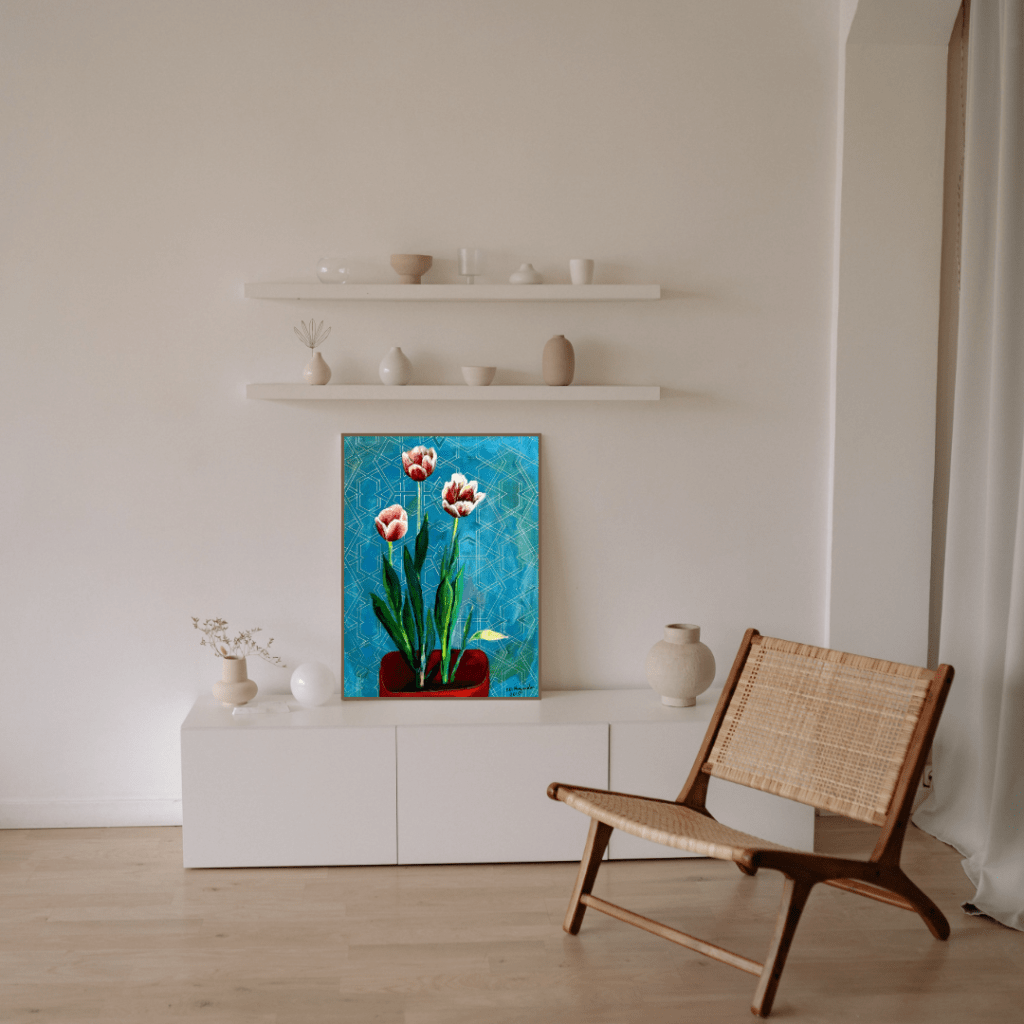 Three blooming tulips in a rich, red vase set against a striking blue background adorned with a delicate geometric pattern. The vivid colors and graceful lines of the tulips contrast beautifully with the intricate design, creating a serene and balanced composition.